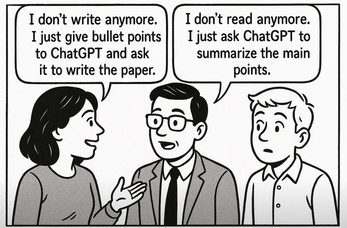 As the cartoon below illustrates, we all seem to be in a hurry to get AI to write something for us, and others may have little intention of reading it because they’ll use AI to read it and summarize it for us. So why not just stick to bullet points and skip the AI middleman?
